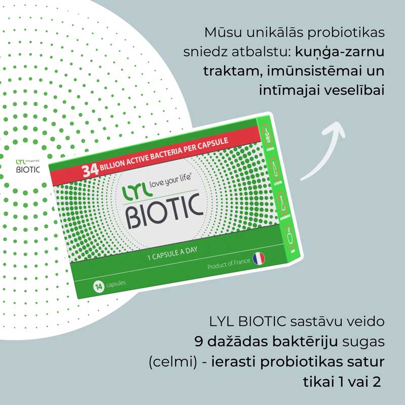 LYL BIOTIC atjauno mikrofloru un veicina labvēlīgo baktēriju veidošanos zarnās, uzlabo gremošanu, palīdz nodrošināt normālu vielmaiņu, novērš aizcietējumu rašanos.