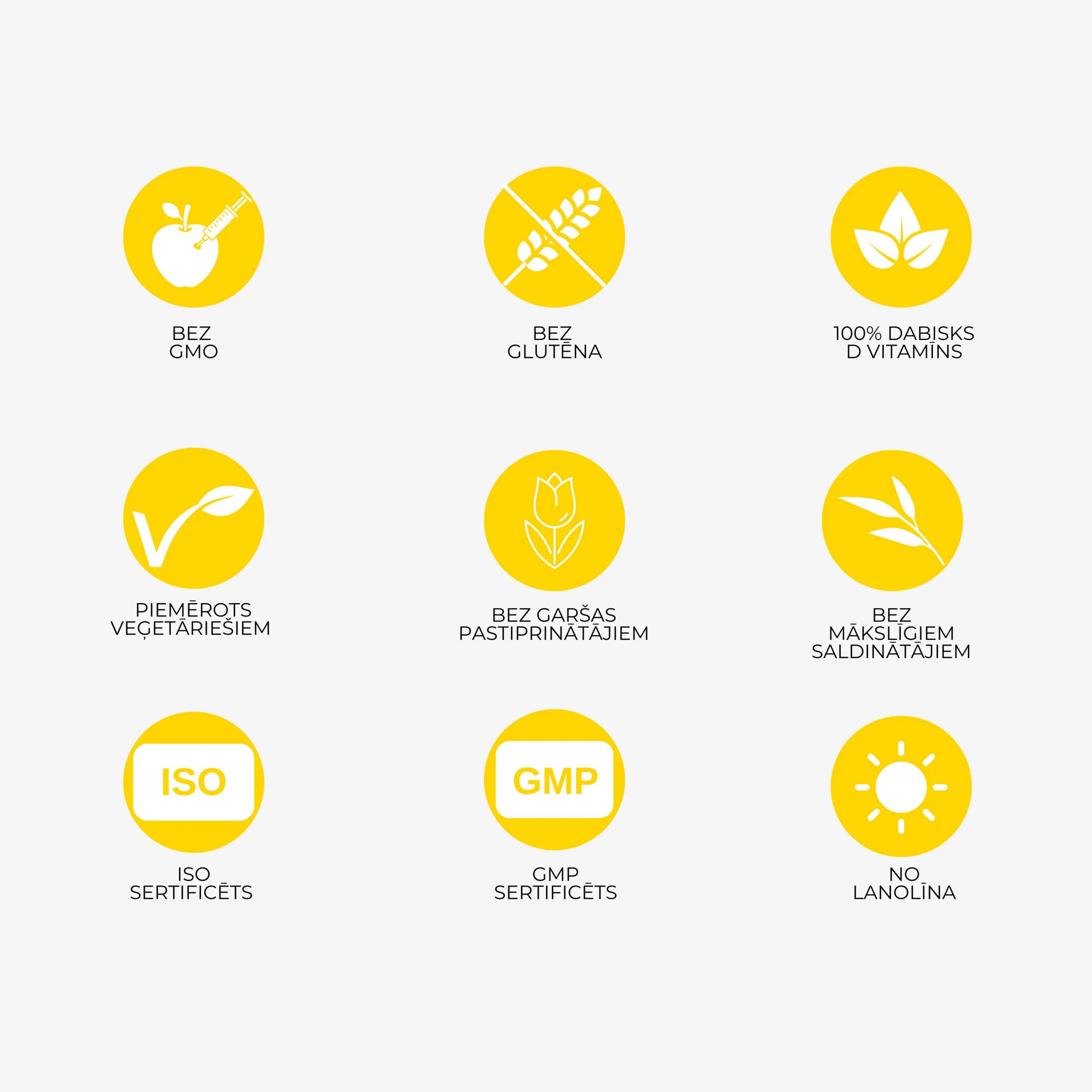 Dabīgas izcelsmes D3 vitamīns (holekalciferols, iegūts no lanolīna), dabīga apelsīnu garša (aromatizētājs), attīrīts ūdens, ksilīts, ksantāna sveķi (biezinātājs), kālija sorbāts (konservants), citronskābe (skābuma regulētājs).