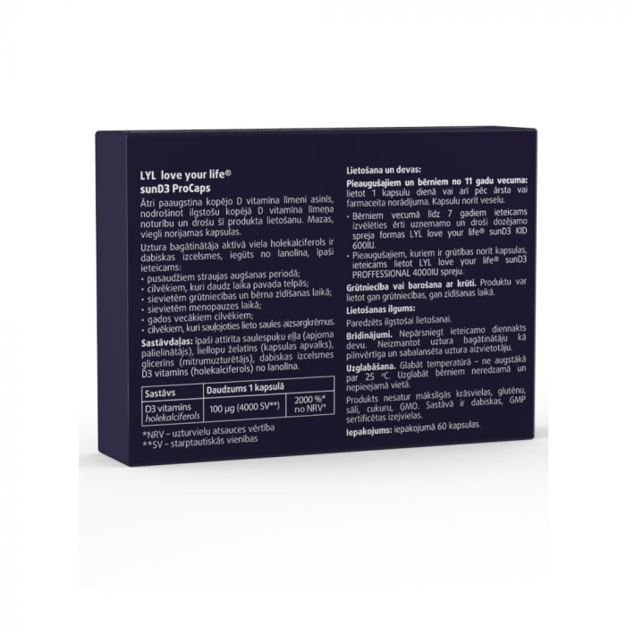 LYL sunD3 ProCaps uztura bagātinātāja aktīvā viela holekalciferols, kas ir visplašāk pētītā un efektīvākā D vitamīna forma, dabiskas izcelsmes, iegūts no lanolīna, īpaši ieteicams: