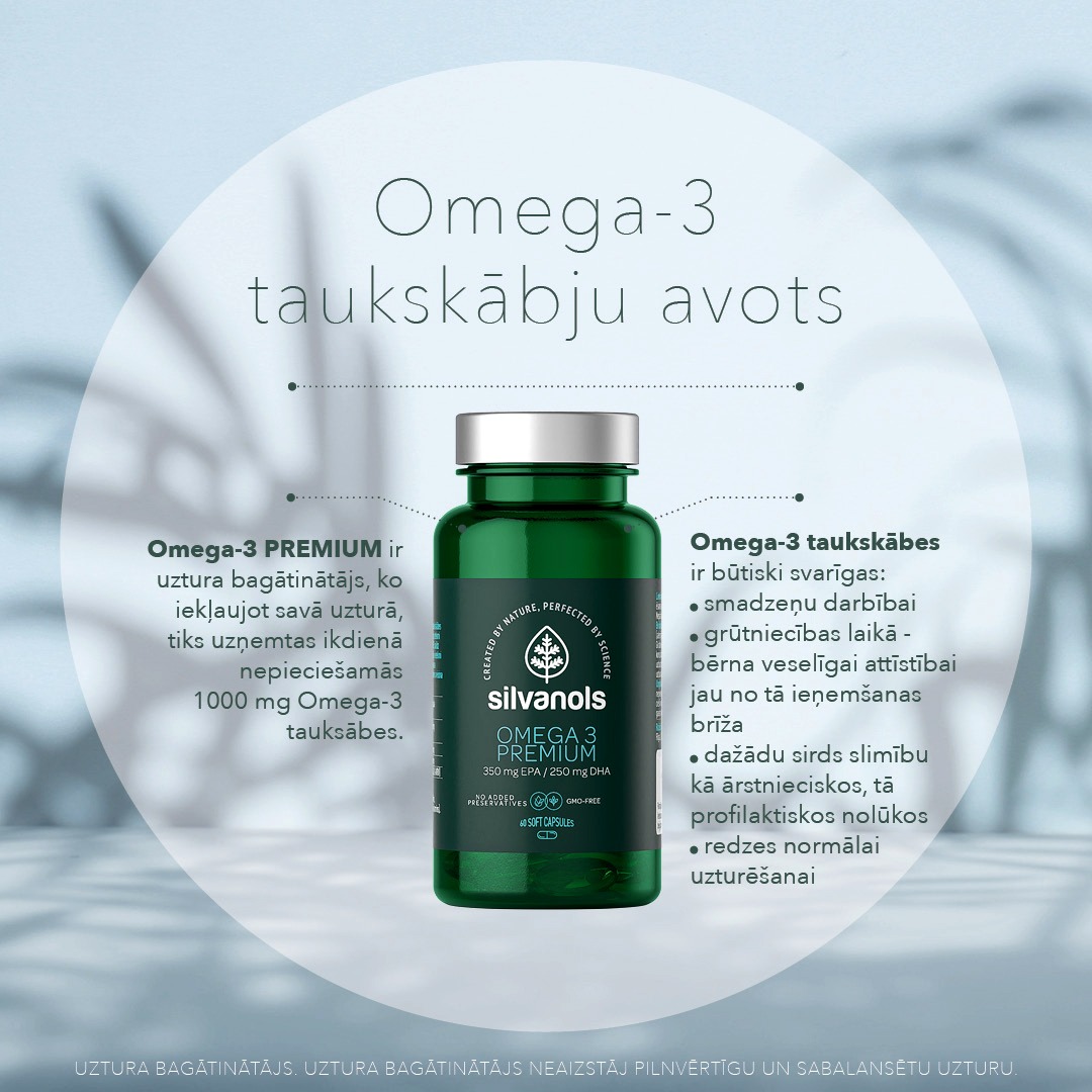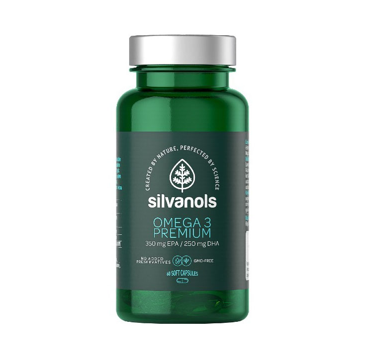Omega-3 taukskābes, kas atrodamas zivju eļļā, ir svarīgas sirds un asinsvadu veselībai. Tās organismā palīdz uzturēt normālu holesterīna līmeni, samazina triglicerīdu līmeni, kā arī palīdz uzturēt veselīgu asinsspiedienu. Omega-3 taukskābes satur EPS un DHS, kuras organisms pats nesintezē. Līdz ar to šīs neaizvietojamās taukskābes ar uzturu ir jāuzņem papildus. Silvanols Omega-3 Premium ir augstas kvalitātes zivju eļļas kapsulas, kas ikdienā Tev palīdzes nodrošināt savu organismu, ar sev nepieciešamajām Omega-3 taukskābēm.