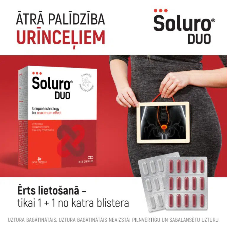 Soluro® Duo satur arī D-Mannozi. D-Mannoze kavē baktēriju pieķeršanos pie urīnpūšļa sieniņām un palīdz tās izvadīt no urīnizvadsistēmas.