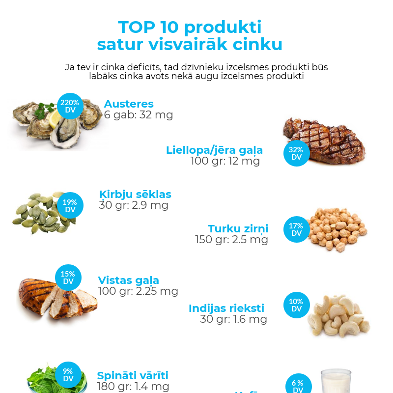 Lasīt vairākCinka deficīts organismā ir gandrīz 75% cilvēku. Cinka trūkums novājina imūnsistēmu, veicina matu plānumu un izkrišanu, izraisa ādas problēmas un ietekmē gremošanas sistēmu.
